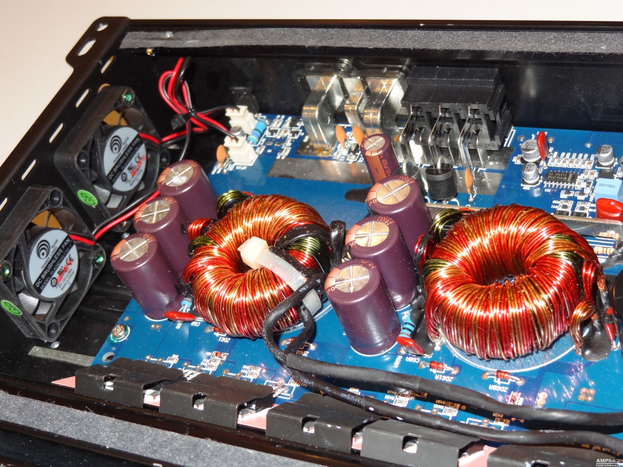 2 × 599 Watt Kanal 1 + 2 sowie 3 + 4 gebrückt an 2 Ohm bei 13,3V Versorgungsspannung