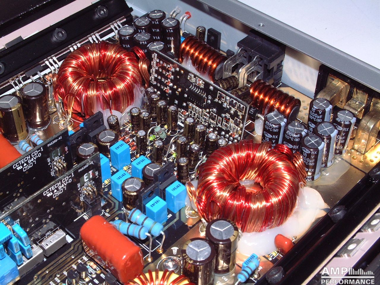 2 × 416 Watt Kanal 1 + 2 sowie 3 + 4 gebrückt an 4 Ohm bei 13,4V Versorgungsspannung
