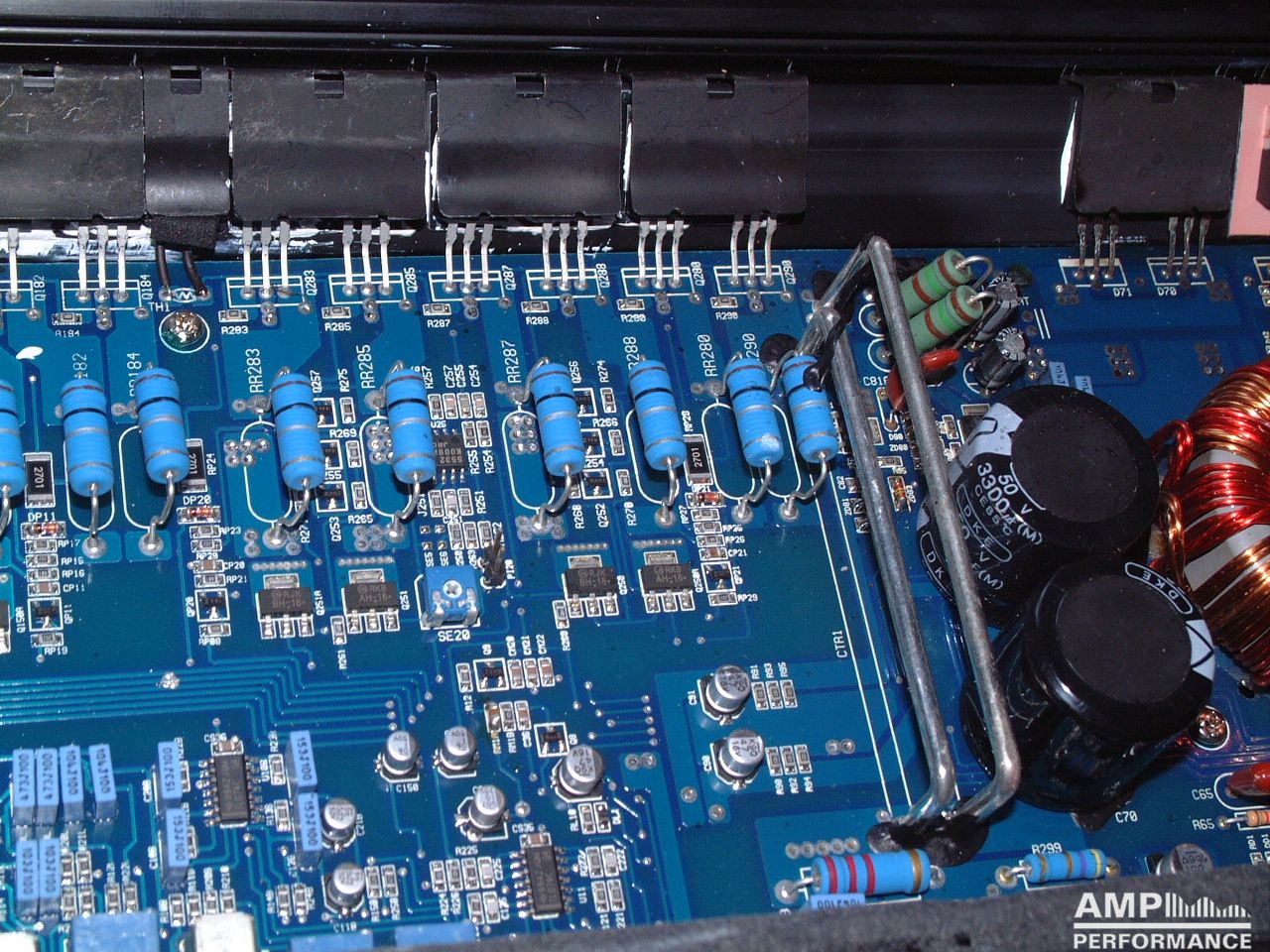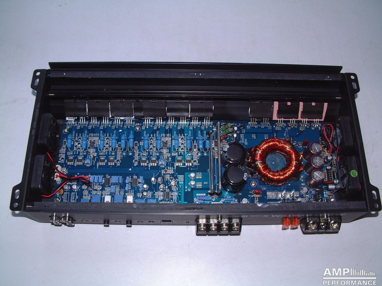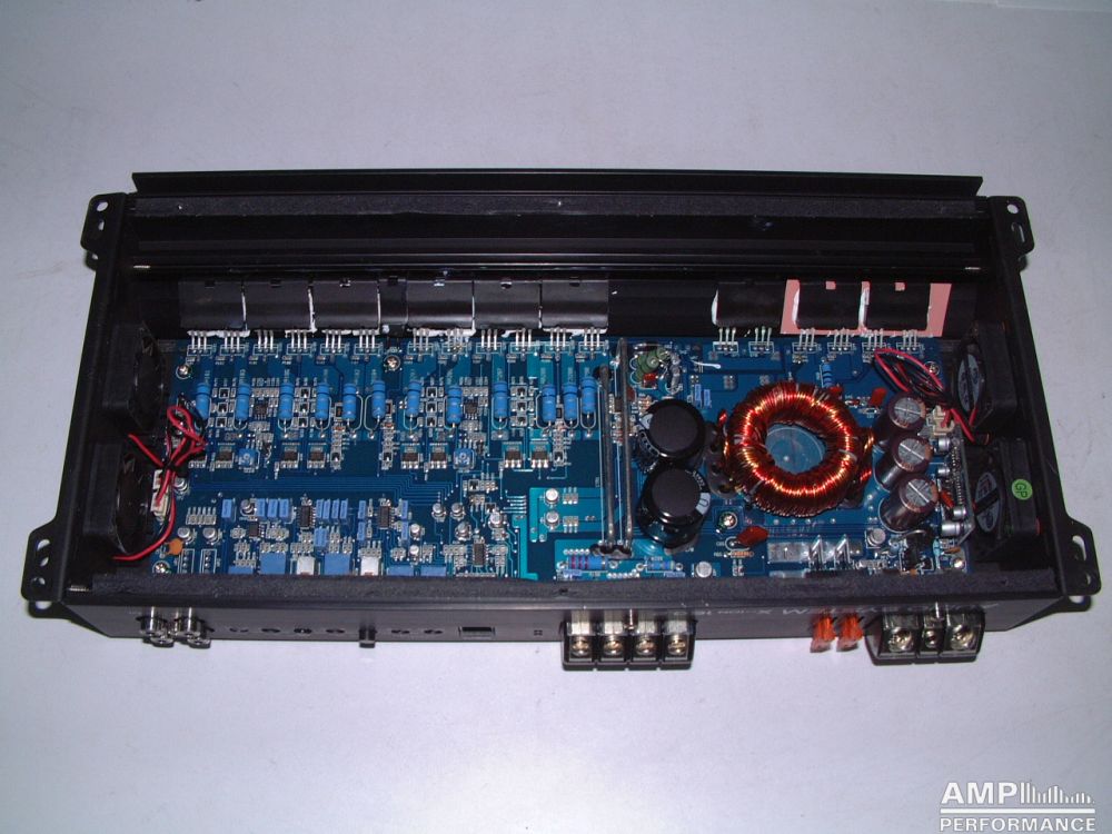 1 × 585 watts, channel 1 + 2 bridged at 2 Ohm with 13,4V supply voltage