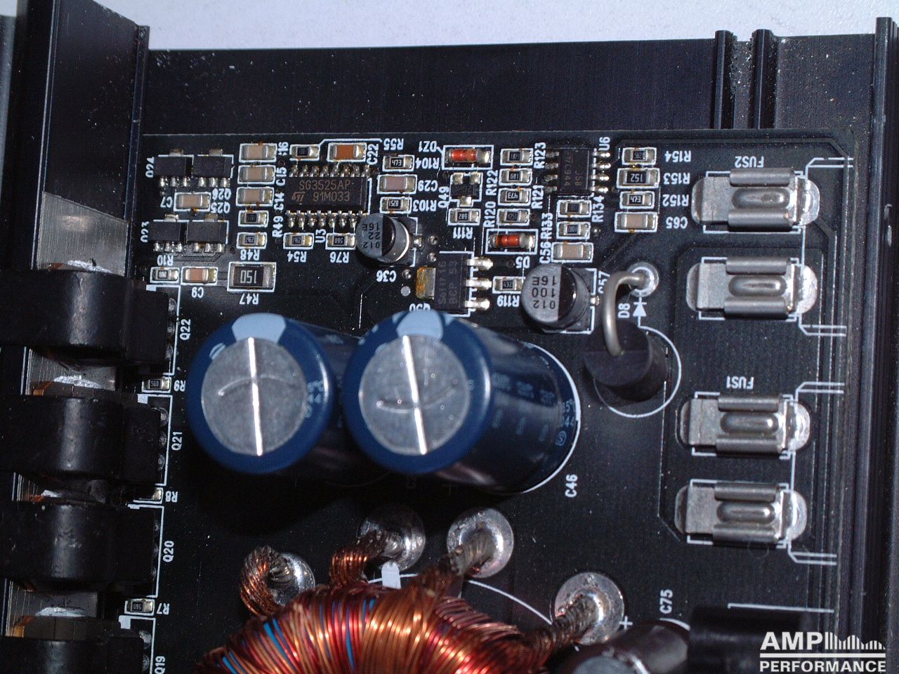 1 × 650 watts, channel 1 + 2 bridged at 4 Ohm with 13,4V supply voltage