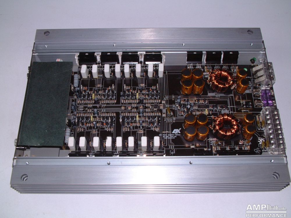 2 × 320 watts, channel 1 + 2 and 3 + 4 bridged at 4 Ohm with 13,4V supply voltage