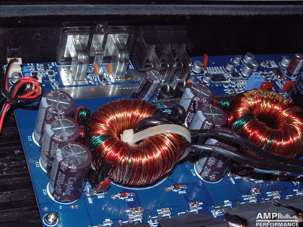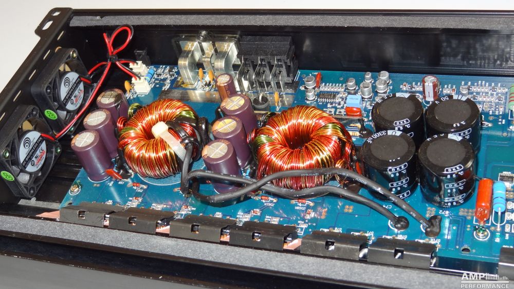 2 × 599 Watt Kanal 1 + 2 sowie 3 + 4 gebrückt an 2 Ohm bei 13,3V Versorgungsspannung