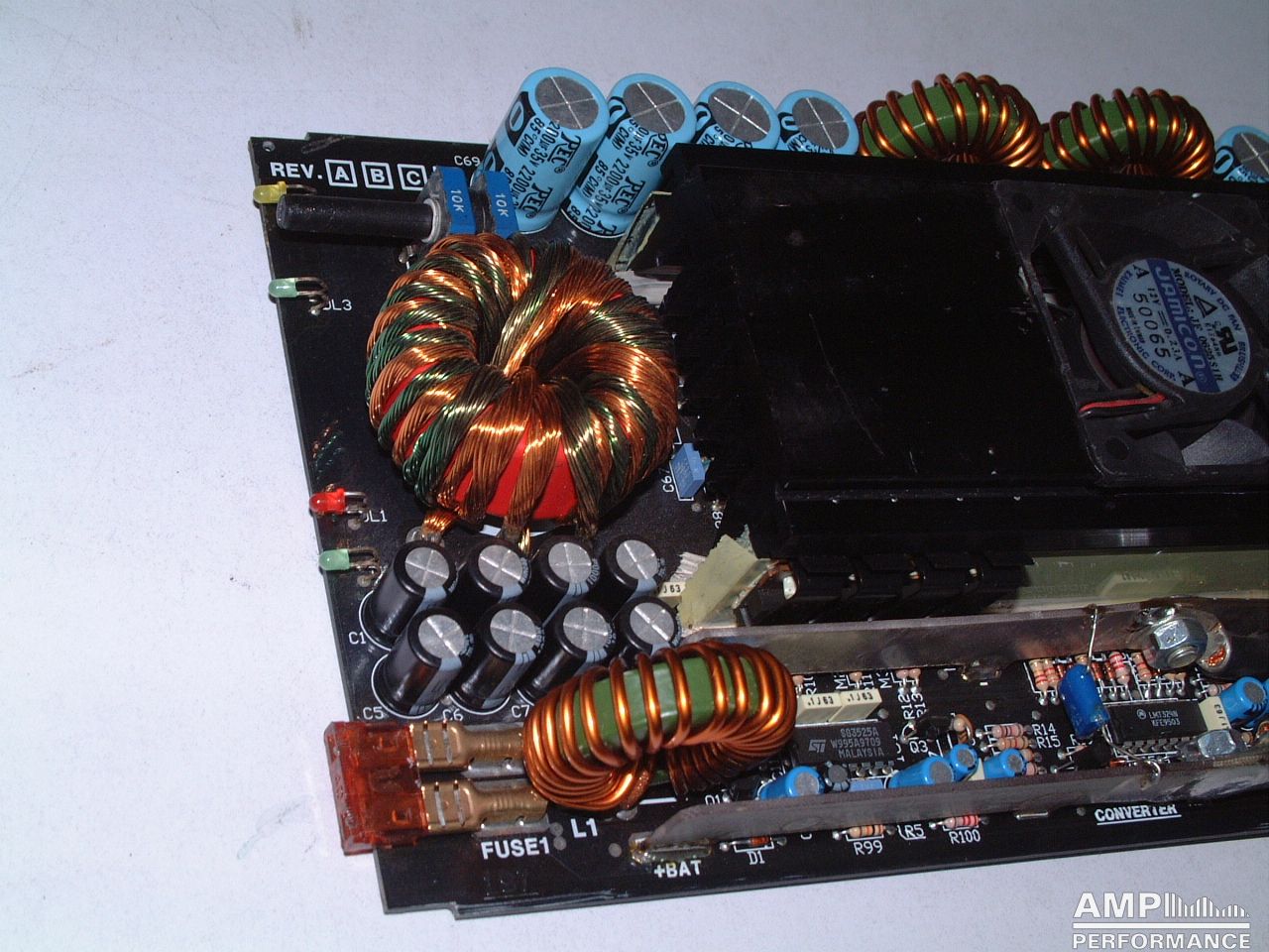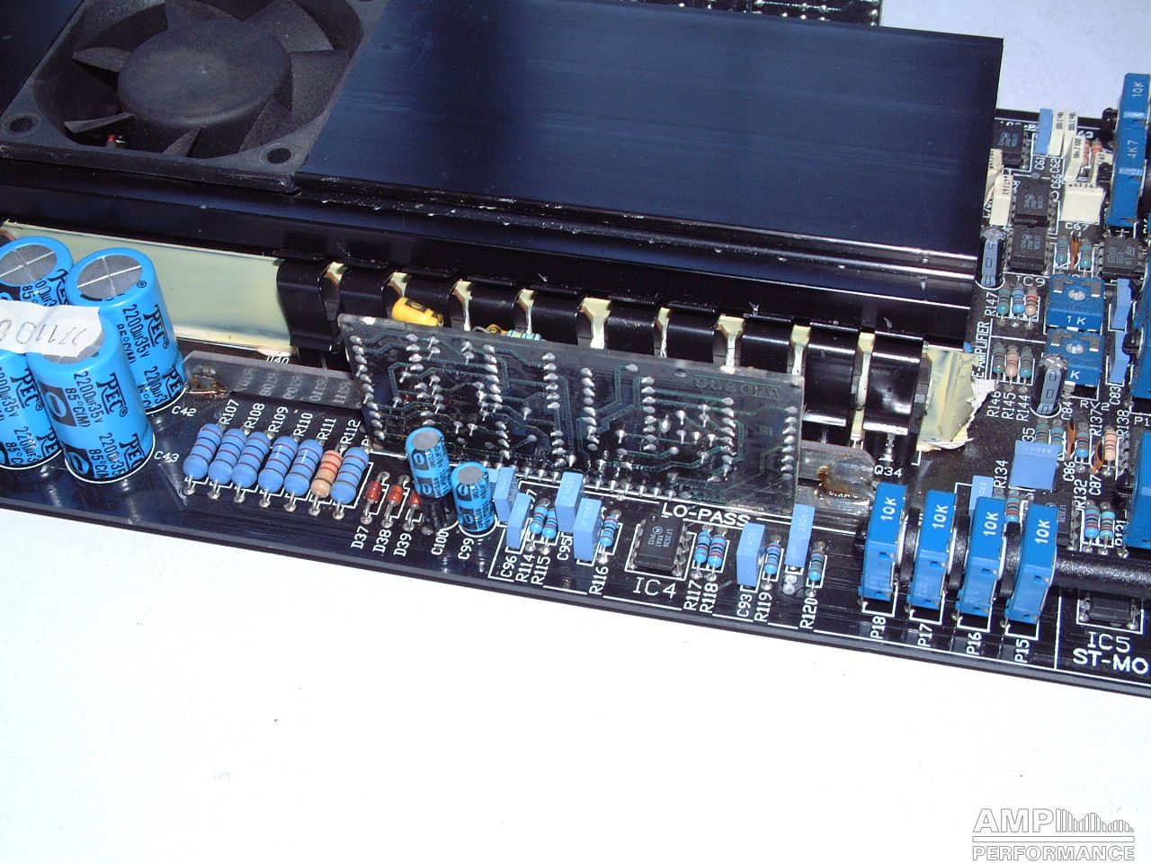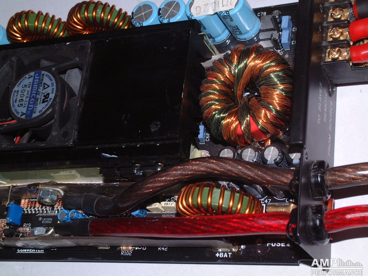 2 × 428 Watt Kanal 1 + 2 sowie 3 + 4 gebrückt an 4 Ohm bei 13,3V Versorgungsspannung