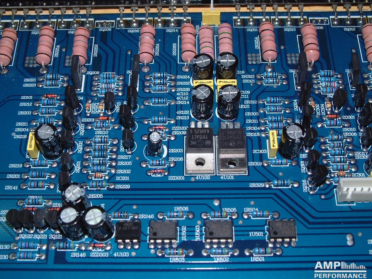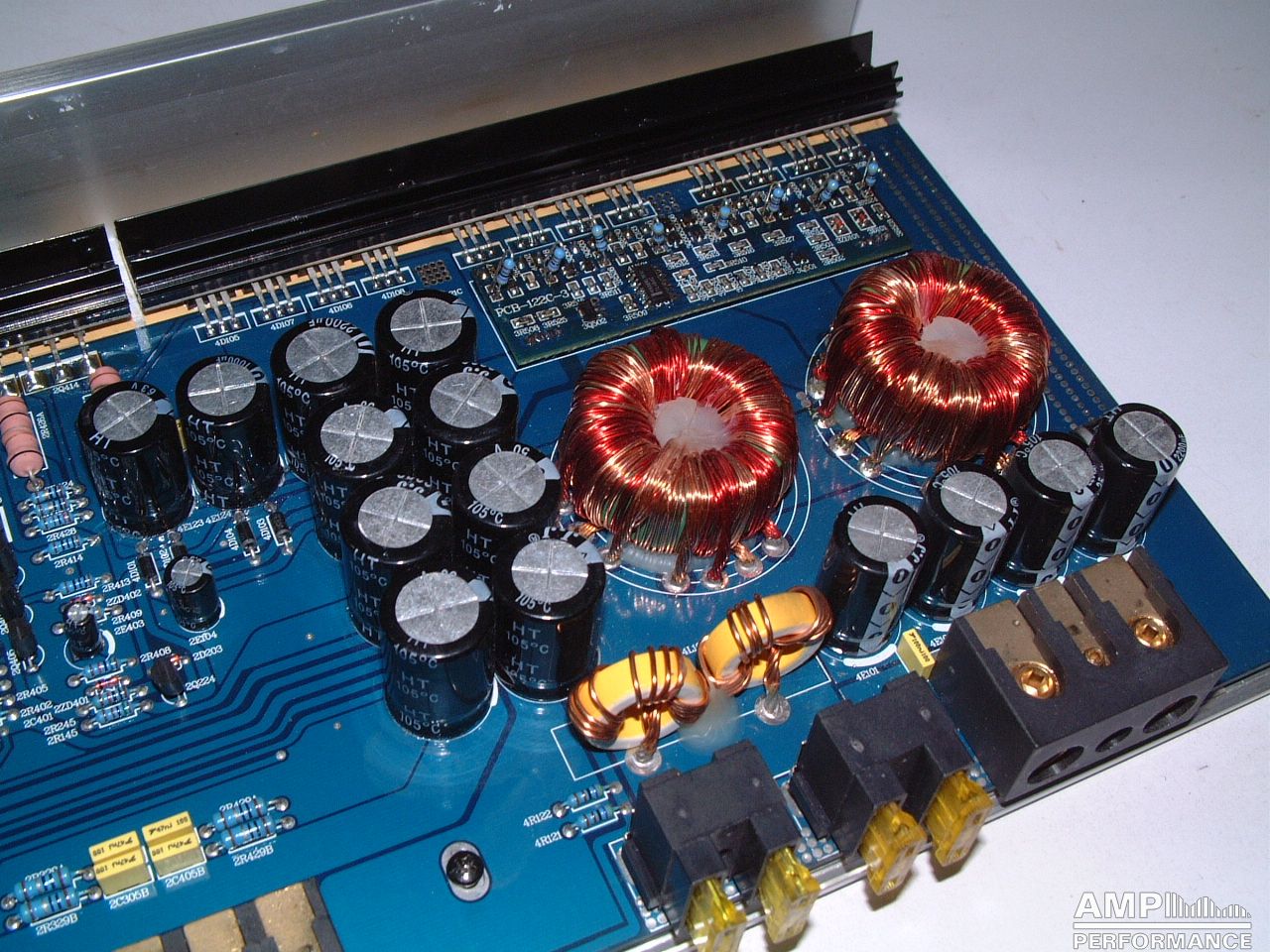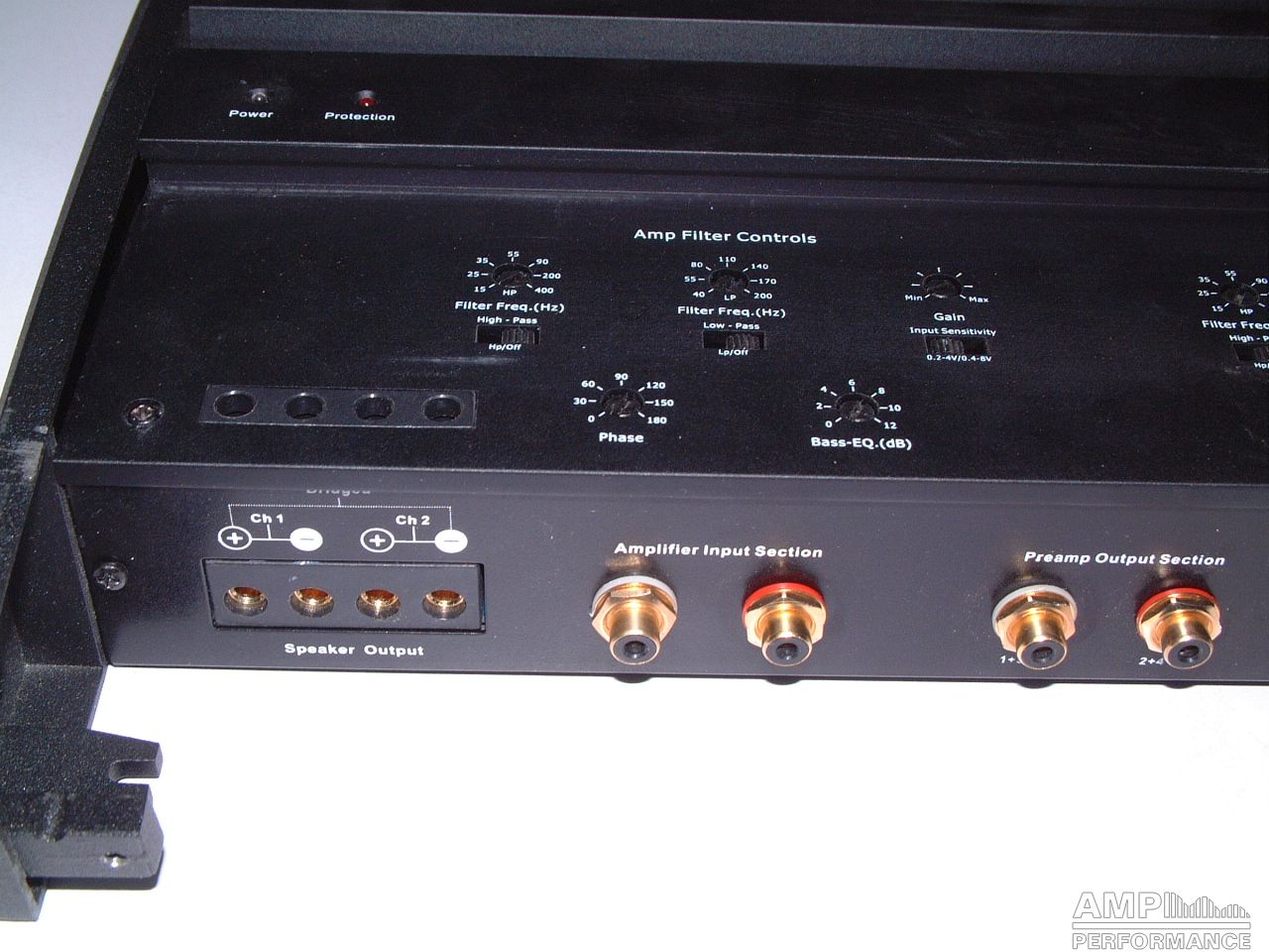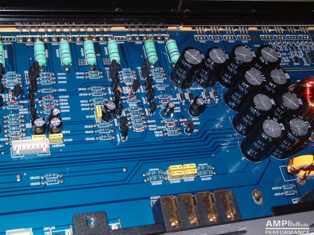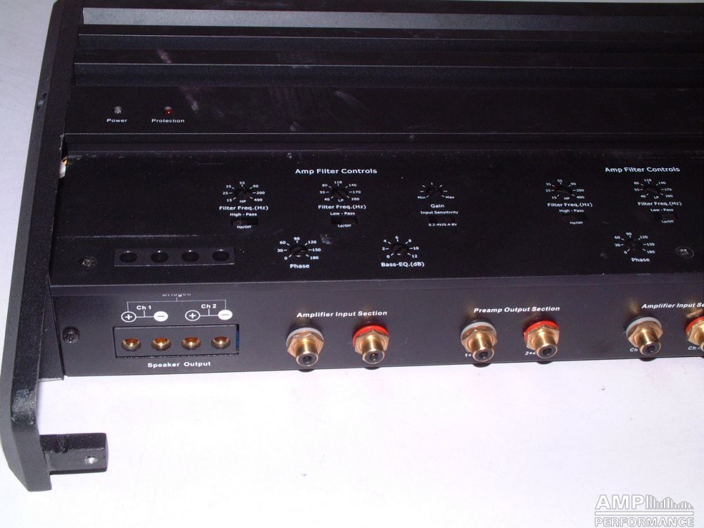 2 × 424 Watt Kanal 1 + 2 sowie 3 + 4 gebrückt an 4 Ohm bei 13,4V Versorgungsspannung