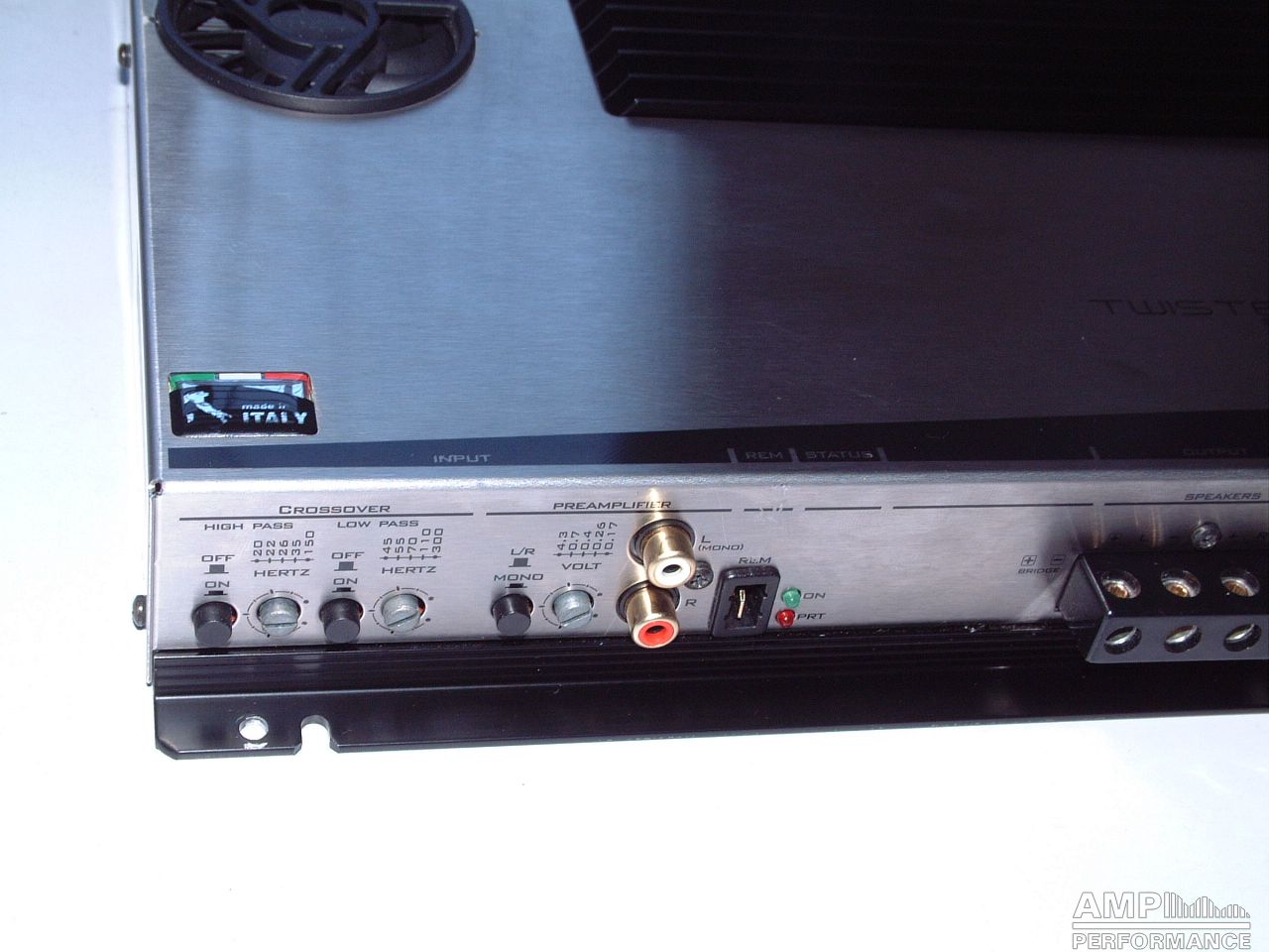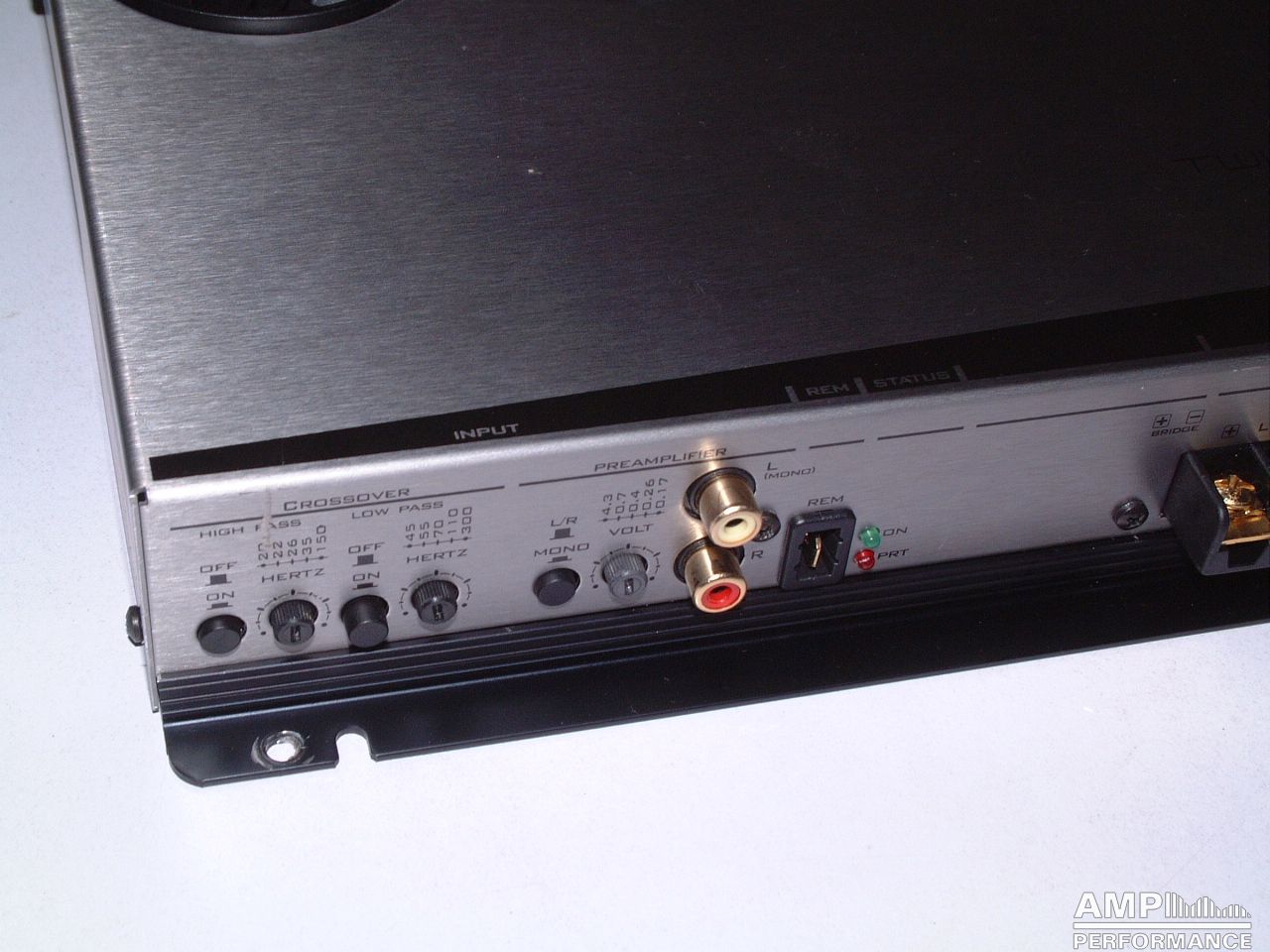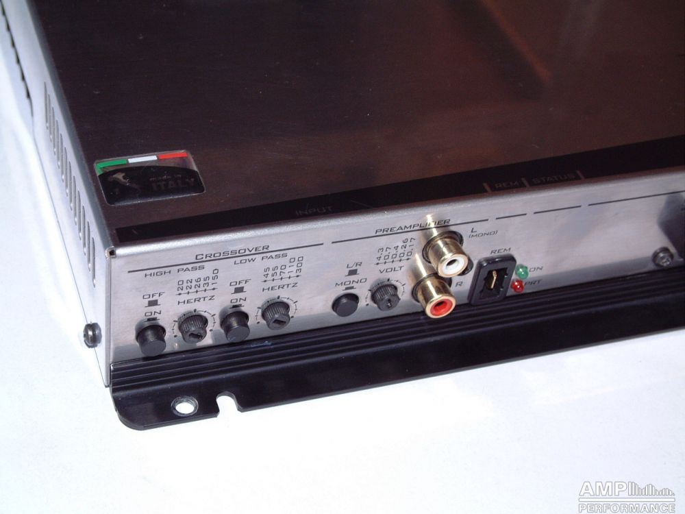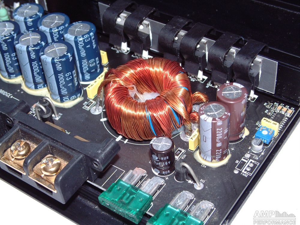 1 × 475 Watt Kanal 1 + 2 gebrückt an 4 Ohm bei 13,4V Versorgungsspannung