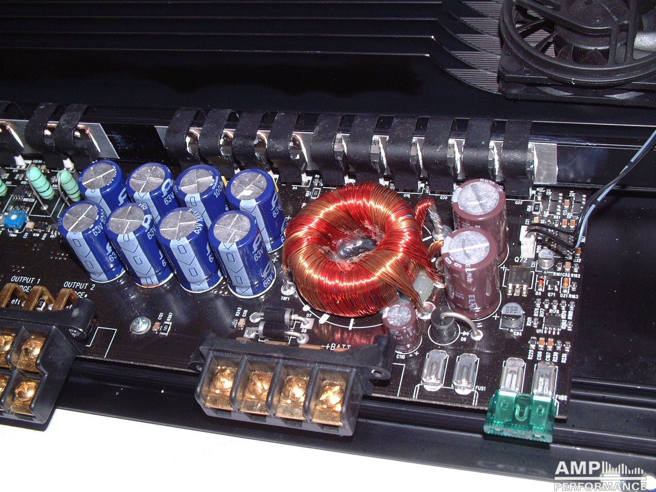 2 × 376 Watt Kanal 1 + 2 sowie 3 + 4 gebrückt an 4 Ohm bei 13,4V Versorgungsspannung