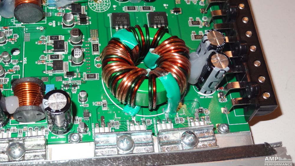 2 × 529 Watt Kanal 1 + 2 sowie 3 + 4 gebrückt an 4 Ohm bei 13,3V Versorgungsspannung