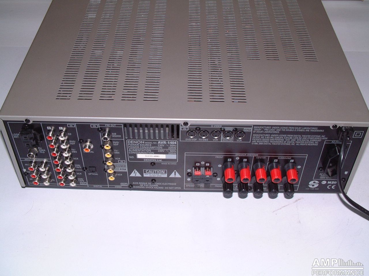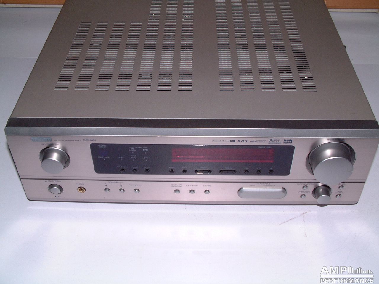 Rated power measured according to DIN 45500 up to 1% distortion factor in 237V Denon AVR-1404 1 × 122 watts, channel 1 at 8 Ohm 2 × 99 watts, channel 1 + 2 at 8 Ohm Keine weiteren Messungen mangels Lastwiderständen
