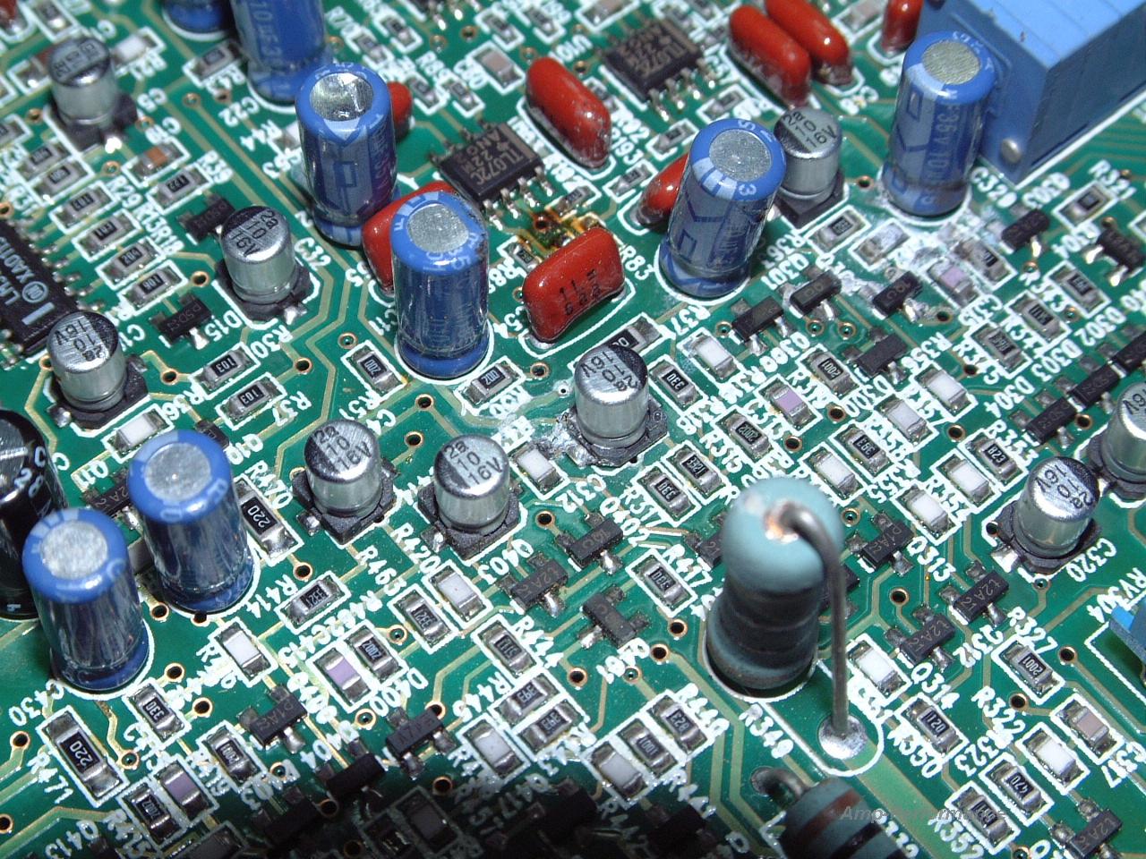 Verätzte Leiterzüge durch ausgelaufenes Elektrolyt auf einer Hybrid-Platine